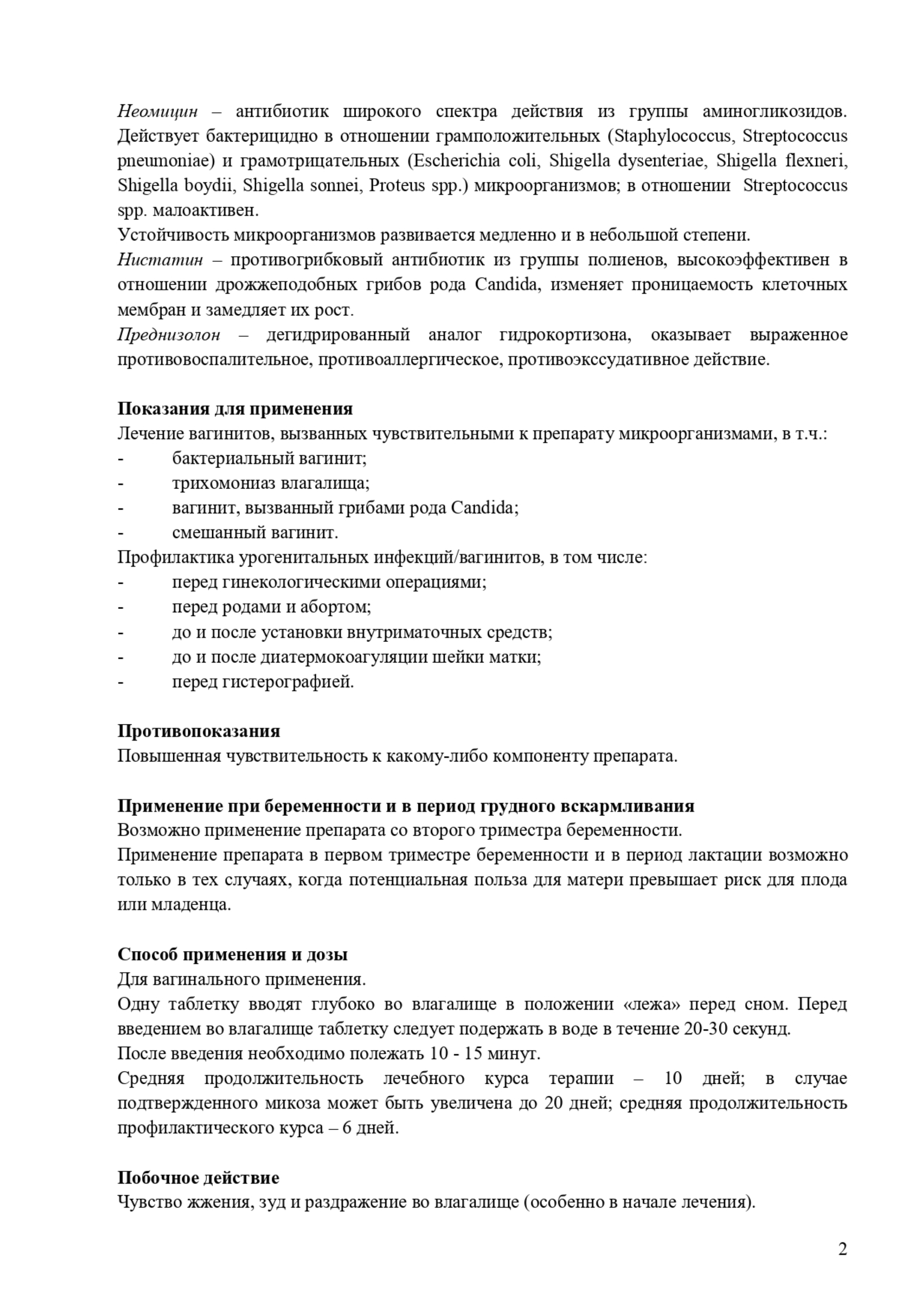 Комбинированный препарат для местного применения в гинекологии. Оказывает противомикробное, противовоспалительное противопротозойное, противогрибковое действие. Обеспечивает целостность слизистой оболочки влагалища и постоянство pH.5